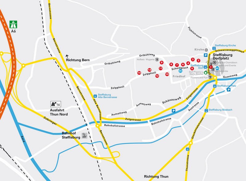 Startpunkt ist der Dorfplatz mit dem Kulturcontainer, der Anziehungspunkt der Ausstellung ist und das Dorf jeweils übers Wochenende mit attraktiven Darbietungen belebt. Die restlichen Container stehen auf Wiesen und öffentlichen Plätzen entlang der Scheidgasse und dem Zelggässli.
