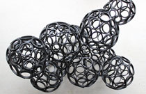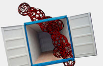 Hans Schüle bringt den Container aus dem Gleichgewicht und verleiht dem Stahl-Koloss visuelle Leichtigkeit. Der Bildhauer verbindet den Container mit einer offenen Metallstruktur, die aus geschnittenen Ringen besteht. Die Metallringe sind zu Kugelelementen zusammengesetzt. Aus diesen luftigen Kugeln gestaltet Schüle biomorphe Formen, die wie Wasserblasen, Gewächse oder Modelle aus dem Chemieunterricht scheinen.