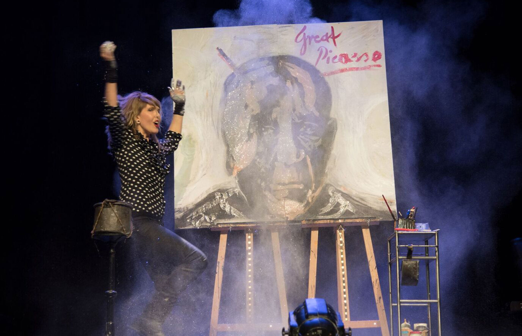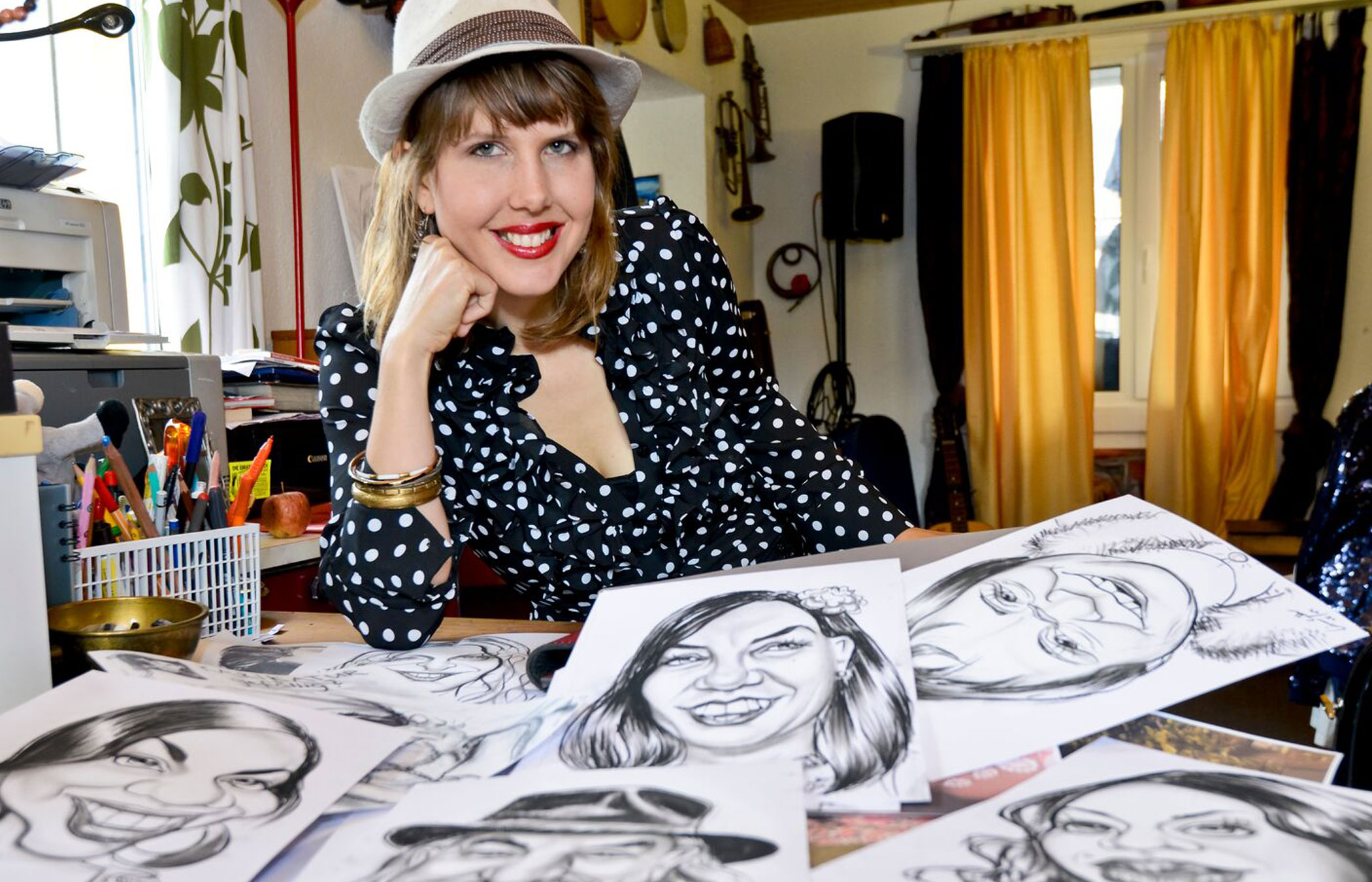 Corinne Sutter ist nicht nur eine witzige, charmante Karikaturistin. Corinne Sutter ist ein echtes Allround-Talent – sie zeichnet, musiziert, performt. Und alles, was sie macht, macht sie mit Verve und Witz. Ihren Container in Steffisburg verwandelt sie in eine Bühne für Speed Paintings. Bei ihren Speed Paintings zeichnet Corinne Sutter im Rhythmus flotter Musik, mal beidhändig, mal kopfüber oder sogar unsichtbar.
