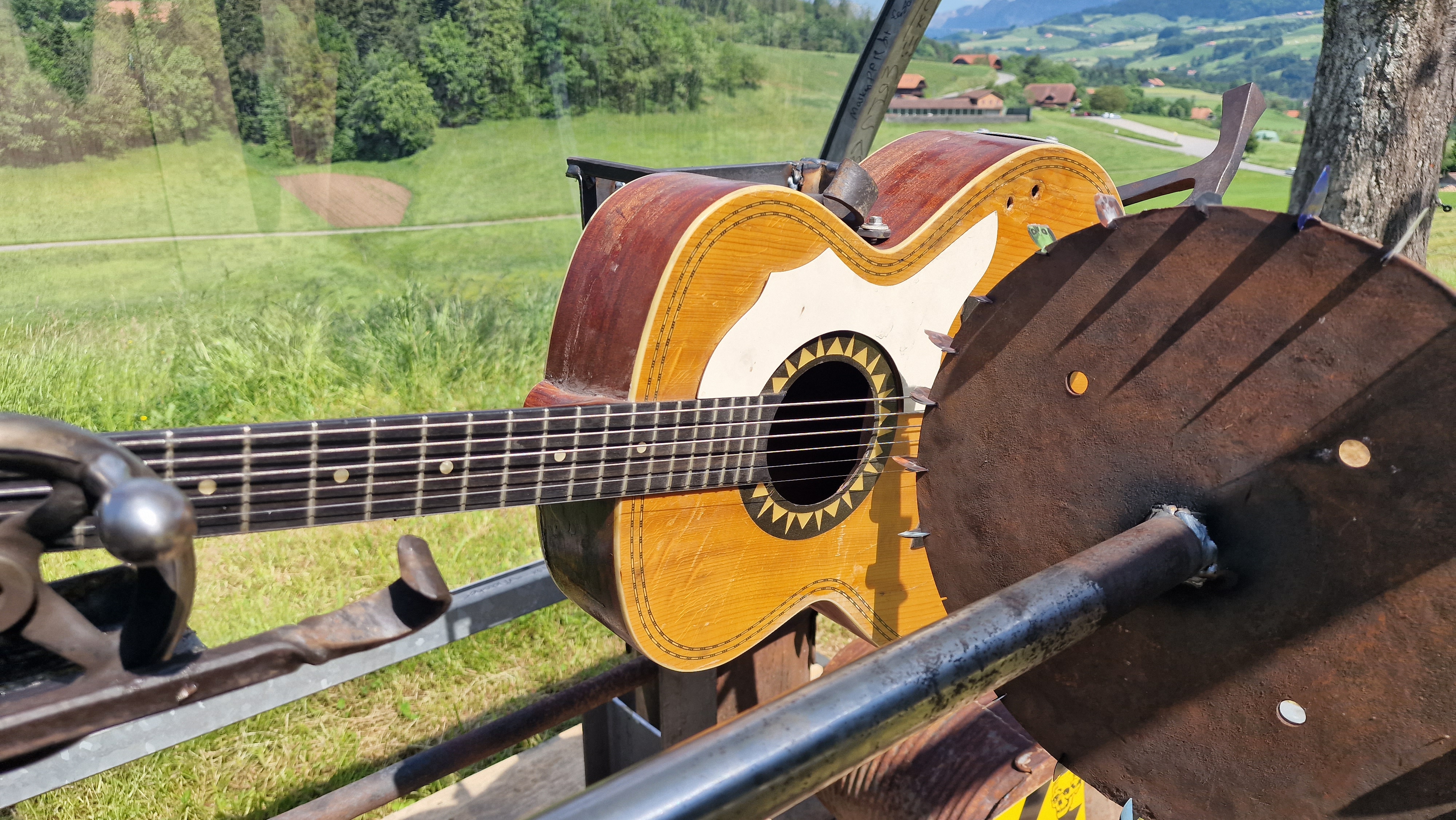 Dass er auch ein begnadeter Tüftler und Erbauer von immer wieder neuen Installationen und Instrumenten ist, zeigt sich bestens in seinem neusten Werk mit dem wunderlichen Namen Gitarredräiwäsesweck.