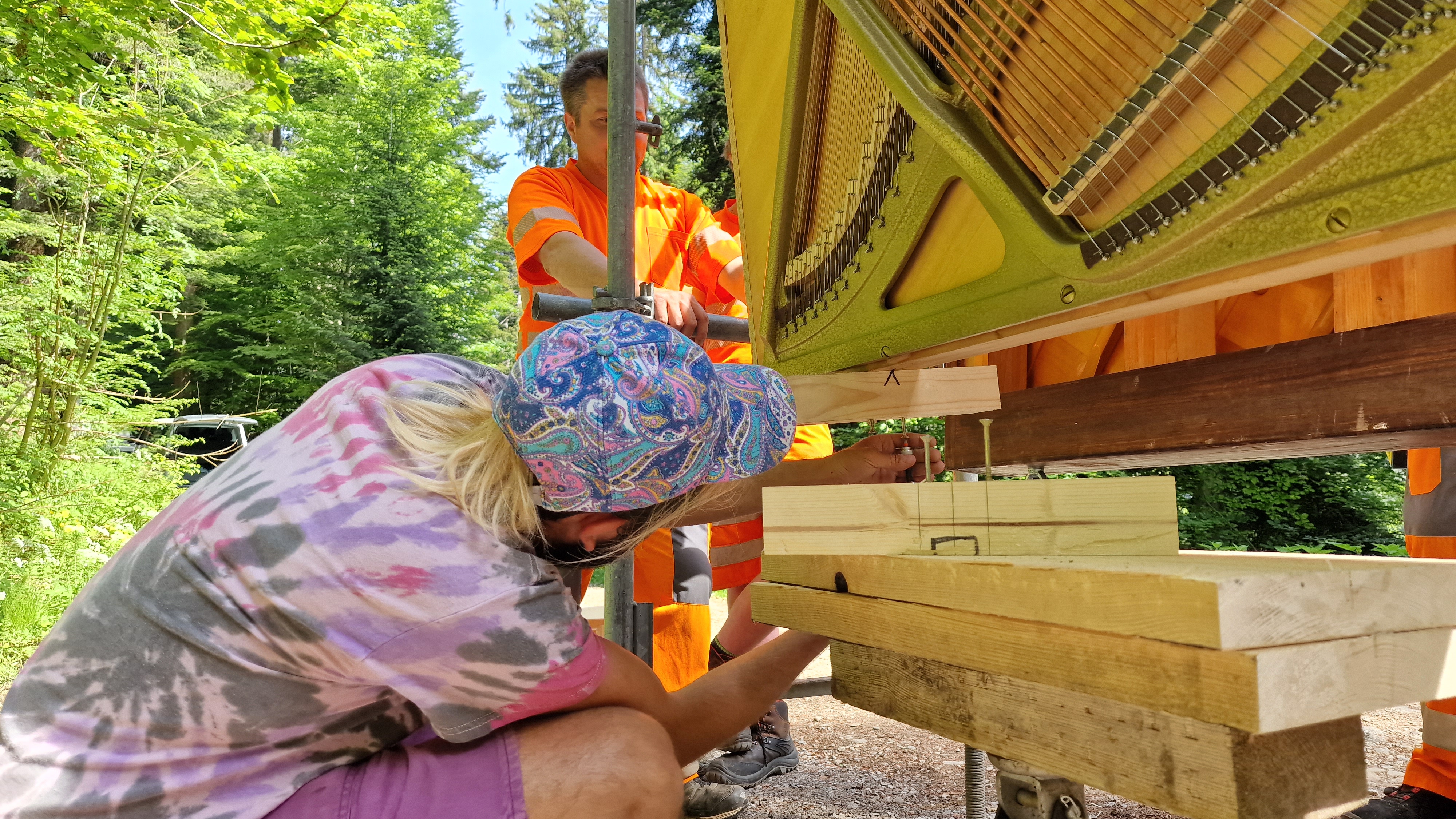 Sehr rein, sehr puristisch und zeitlos. Klang entsteht überall und begleitet uns seit Anbeginn der Zeit. Er ist Herzschlag der Erde und Grundstein für unsere Art von Kommunikation. Kommunikation bedeutet: Verbindung, Verständigung oder Austausch. Darauf basiert dieses Kunstwerk: das Swingano. Inmitten der steffisburger Natur befindet sich nun das erste Swingano der Welt. Es besteht aus den Herzen von zwei Klavieren die an einem Gerüst freischwebend festgemacht sind und durch verschiedene Schläger zum Klingen gebracht werden können. So entsteht Klang.