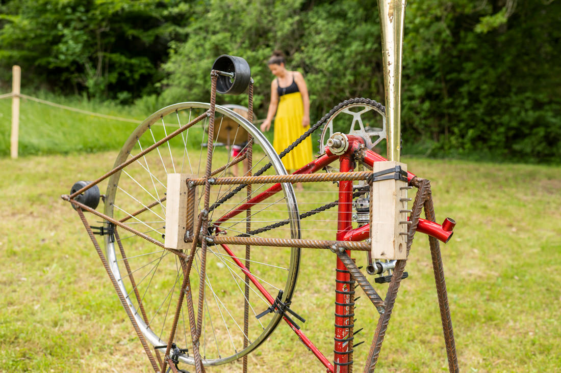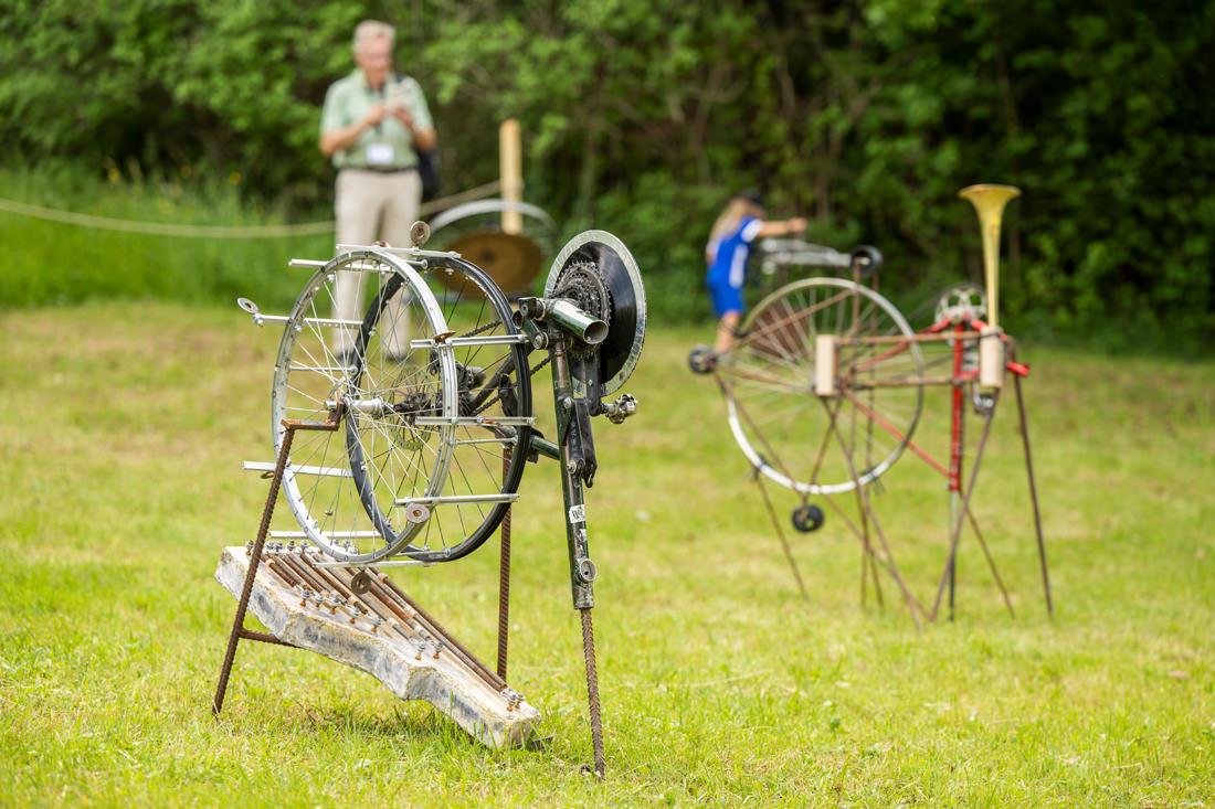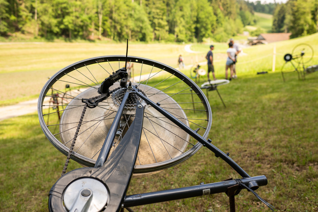 Für die Art Container Steffisburg 21/22 hat der Musiker, Künstler und Erfinder Philipp Läng verschieden Installationen geschaffen, die von den Besucherinnen und Besuchern selbst zum Klingen gebracht werden können. Die Installationen bestehen aus diversen Klang- Objekten. Ausgediente Velos dienen als Antrieb für je einen Klang-Loop. Wird ein Pedal von Hand bewegt, entsteht ein Geräusch, mit der Geschwindigkeit wird der Klang differenziert. Die 7 Objekte stehen auf einem Platz und dürfen selbständig bedient werden.