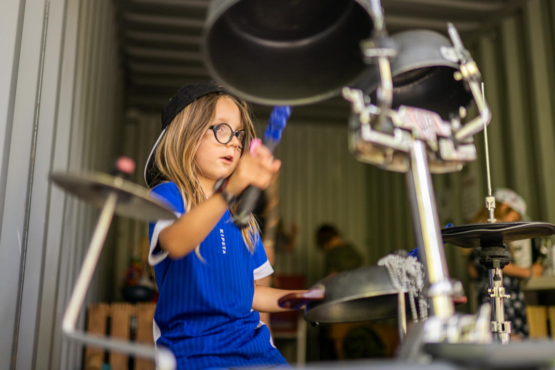 Sandra Schorers Schiffscontainer ist mit verschiedenen Percussions- und Schlaginstrumenten ausgestattet. Neben Tongue Drums, Kalimba und Boomwhackers steht unter anderem ein Schlagzeug aus Alltagsgegenständen, sowie ein Vintage-Schlagzeug zum Bespielen bereit. Kannst Du die Rockgrooves spielen? Zudem wird es auch ein Gewinnspiel geben: Wer erkennt das Füllmaterial der Dosenshaker?
