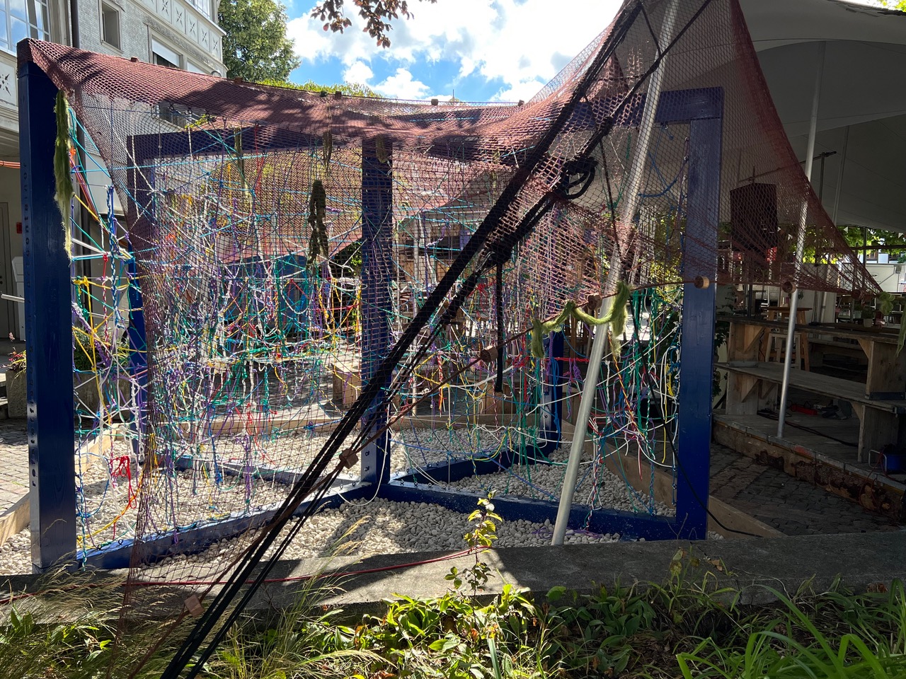 Auf dem Dorfplatz erstrahlt der Holzrahmen von «Stäffisburg verchnüpft» in meerblauer Farbe und er liegt im Kies wie auf einem Meeresboden. Ein Fischernetz ist darübergespannt und es hängen vereinzelt Algen... Das Seilkunstwerk des Flühlileists, entstanden während der «KlangArt» im Schnittweiertal, verwandelt sich nach und nach in eine Unterwasserwelt!